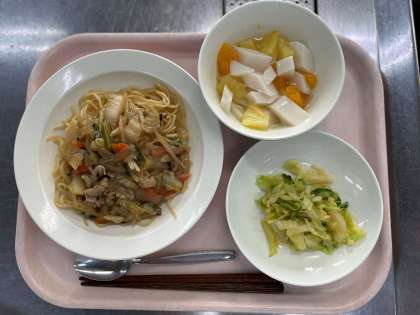 今日の給食は、炒めそば五目あんかけ、野菜の中華風味、杏仁豆腐、牛乳です。