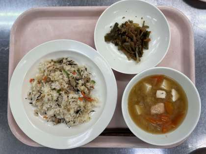 今日の給食は、五目ごはん、石狩汁、茎わかめのキンピラ、牛乳です。
