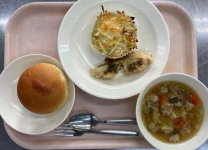 今日の給食は、チーズパン、フィレ・ド・ぺルシュ、レシュティ、白いんげんの田舎風スープ、牛乳です。