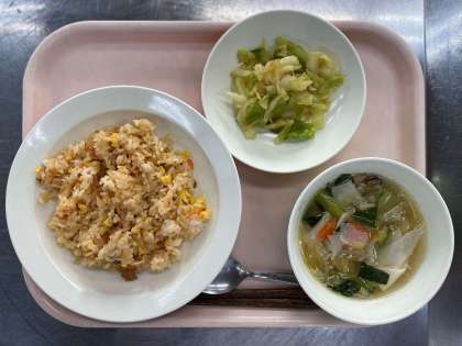 今日の給食は、キムチチャーハン、ワンタンスープ、野菜の中華風味、牛乳です。