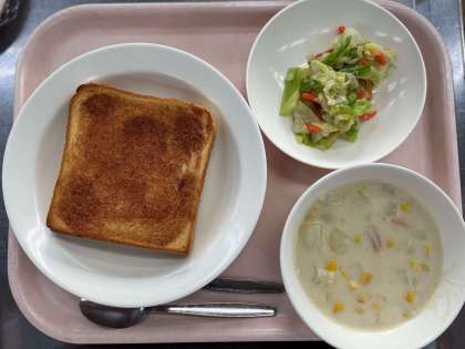 今日の給食は、シナモントースト、コーンシチュー、フレンチサラダ、牛乳です。