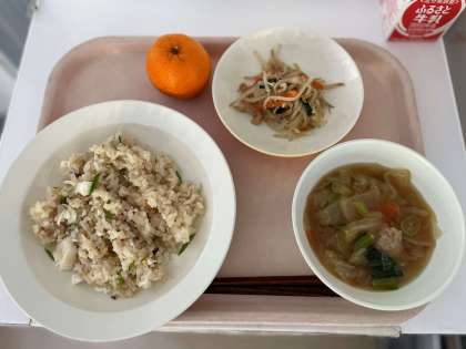今日の給食は、鯛めし、油揚げと野菜のおひたし、肉団子入りみそ汁、ぽんかん、牛乳です。