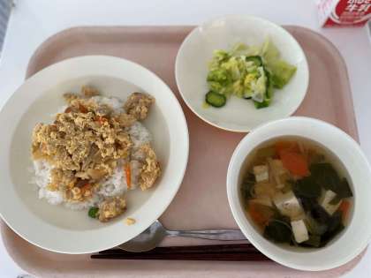 今日の給食は、親子丼、野菜のひとしお、すまし汁、牛乳です。