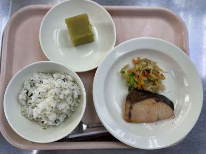 今日の給食は、菜めし、魚の照り焼き、野菜のだしじょうゆ、芋ようかん、牛乳です。