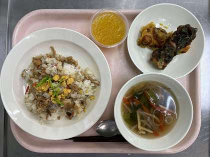 今日の給食は、ちらしずし、ちくわの二色揚げ、沢煮椀、ももゼリー、牛乳です。