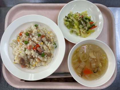 今日の給食は、チャーハン、海藻サラダ、中華スープ、牛乳です。