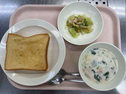 今日の給食は、ハニートースト、サーモンチャウダー、ビーンズサラダ、牛乳です。