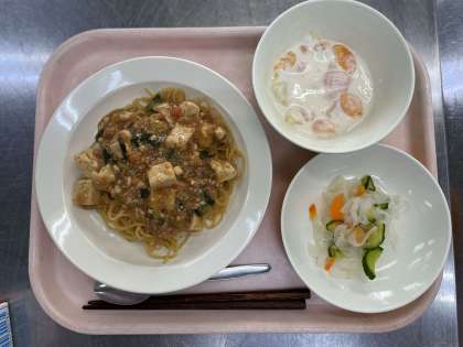 今日の給食は、麻婆麺、華風甘酢、フルーツヨーグルト、牛乳です。