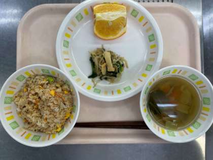 今日の給食は、そぼろごはん、カリカリ油揚げと野菜のひたし、根菜汁、くだもの(甘夏みかん)、牛乳です。