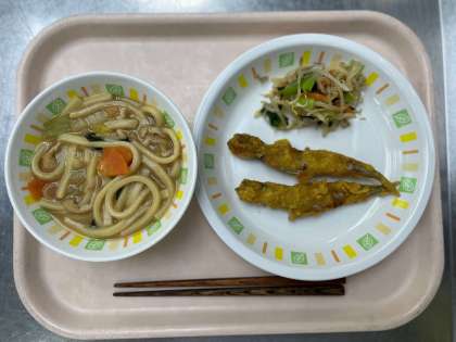 日の給食は、煮込みうどん、ししゃものカレー天ぷら、青菜のおひたし、牛乳です。