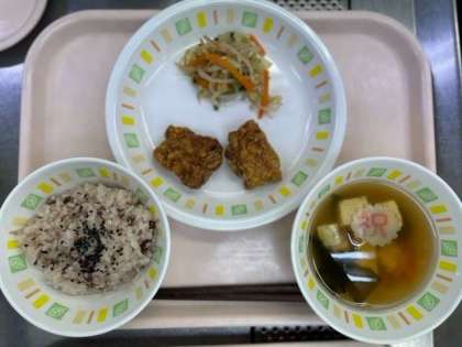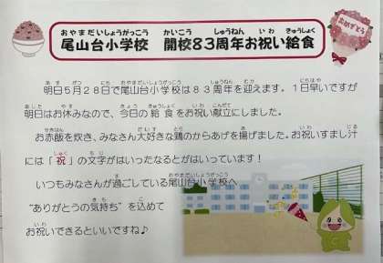 今日の給食は、赤飯、鶏のからあげ、野菜のおかかあえ、お祝いすまし汁、牛乳です。5月28日(金)は尾山台小学校83周年です。1日早いですが、今日はお祝い給食でお祝いをしました!