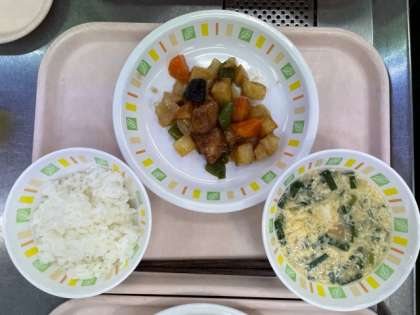 今日の給食は、ごはん、酢豚、にらたまスープ、牛乳です。