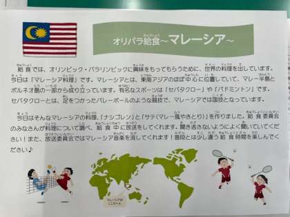 給食委員会でマレーシアの料理について調べたことを放送したり、放送委員会ではお昼の放送でマレーシア音楽を流すなど、いつもと違った給食時間を楽しんでいました♪