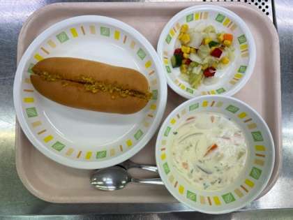 今日の給食は、ドライカレーサンド、ポテトスープ、トロピカルサラダ、牛乳です。