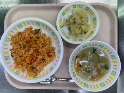 今日の給食は、チキンライス、ジャーマンポテト、ABCスープ、牛乳です。