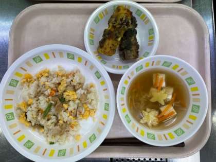 今日の給食は、子ぎつねごはん、ちくわの二色揚げ、七夕汁、牛乳です。