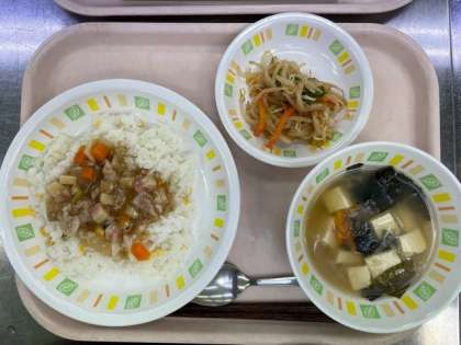 今日の給食は、あんかけチャーハン、わかめスープ、もやしのコチジャンかけ、牛乳です。