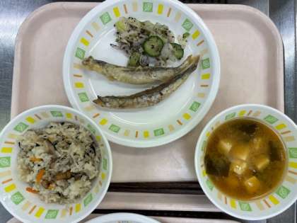 今日の給食は、五目ごはん、ししゃもの天ぷら、野菜のゆかりかけ、みそ汁(豆腐とわかめ)、牛乳です。