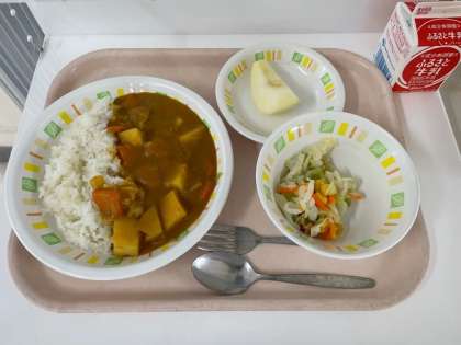 今日の給食は、チキンカレーライス、コーンサラダ、くだもの(りんご)、牛乳です。