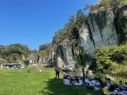 大谷資料館の見学後は、すぐそばの公園で楽しみにしていたお弁当です。快晴すぎて、太陽ギラギラ。でも、足元一面のクローバーが、ひんやりさせてくれています。