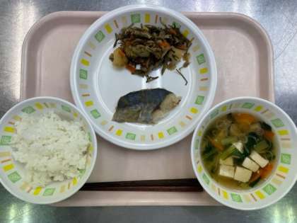 今日の給食は、ごはん、魚の西京焼き、きざみこんぶの五目煮、吉野汁、牛乳です。