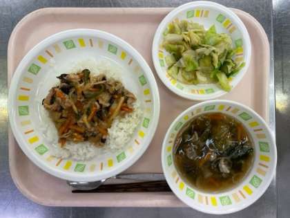 今日の給食は、スタミナ丼、春雨スープ、野菜の中華かけ、牛乳です。