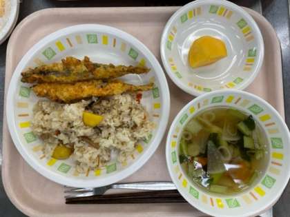 今日の給食は、秋の香りごはん、ししゃものもみじ揚げ、根菜汁、くだもの(柿)、牛乳です。