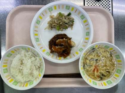 今日の給食は、ごはん、魚の甘酢あんかけ、おひたし、かきたま汁、牛乳です。