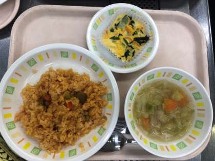 今日の給食は、チキンライス、キッシュ、キャベツスープ、牛乳です。