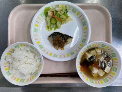 今日の給食は、ごはん、魚のごまだれかけ、即席漬、すまし汁、牛乳です。