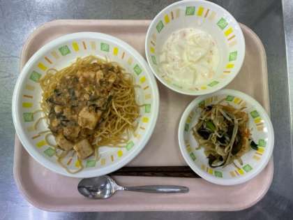 今日の給食は、麻婆麺、もやしとわかめのあえもの、フルーツヨーグルト、牛乳です。