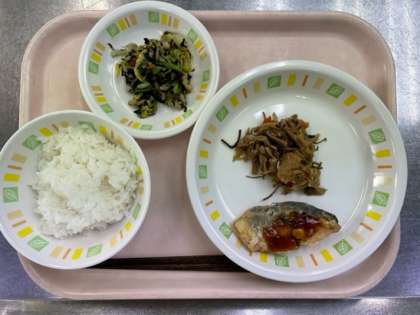 今日の給食は、ごはん、魚のしょうが風味、切干大根の煮つけ、野菜ののりあえ、牛乳です。