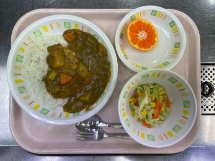 今日の給食は、シーフードカレーライス、コーンサラダ、くだもの(真鶴みかん)、牛乳です。