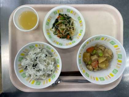 今日の給食は、わかめとじゃこのごはん、じゃがいものそぼろ煮、青菜のおひたし、りんごゼリー、牛乳です。