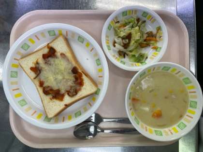 今日の給食は、ピザトースト、クリームスープ、ごぼうチップサラダ、牛乳です。