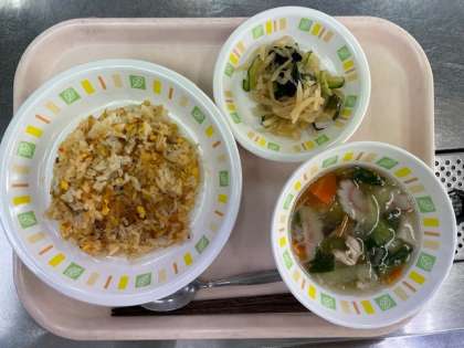 今日の給食は、キムチチャーハン、ワンタンスープ、大根とわかめのサラダ、牛乳です。