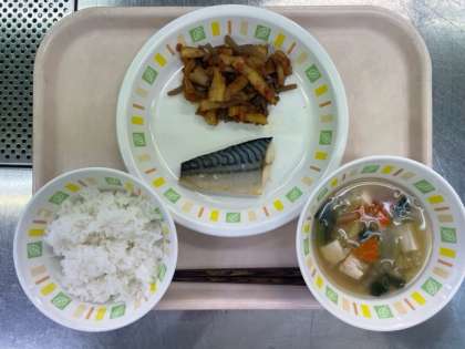 今日の給食は、ごはん、さばの塩焼き、じゃがいものキンピラ炒め、豆腐汁、牛乳です。