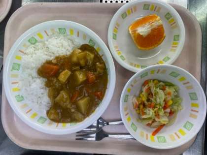 今日の給食は、チキンカレーライス、コーンサラダ、くだもの(早香)です。