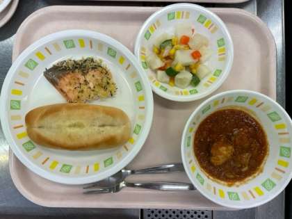 今日の給食は、ソフトフランスパン、鮭のオーブン焼き、ミートボールトマト煮込み、ポテトサラダです。