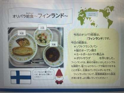 今月のオリパラ給食は、フィンランドでした。給食委員会の子どもたちが、フィンランドの料理をやりたいと調べてくれ、実現しました。