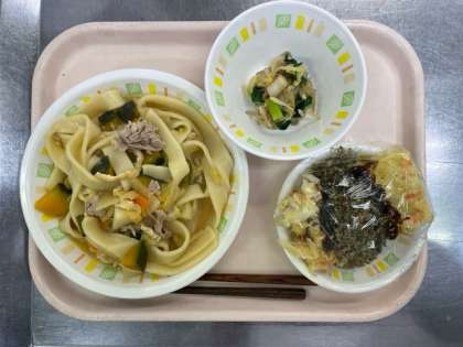 今日の給食は、ほうとう、お好み焼き、ゆず香あえです。