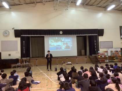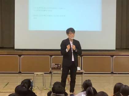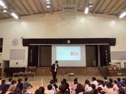 12月21日(火)の1、2時間目、講師にアテネオリンピック水泳・個人メドレー第六位の森隆弘選手をお招きしてご講演いただきました。子どもたちに目標や夢を叶えるための方法を教えてくださいました。森選手の幼少期や選手時代の体験を織り交ぜながらお話で、子どもたちは最後まで集中して学習することができました。