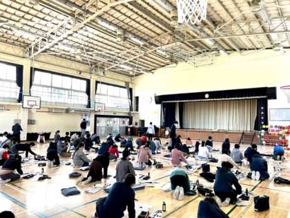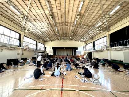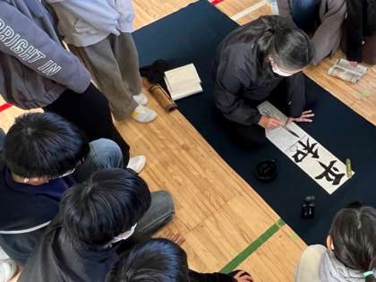 1月12日(火)の3,4時間目、体育館で書き初め会を行いました。講師に書道家の齊藤燦月先生をお招きして、書き方のポイント、筆の運びなどを教えていただきました。