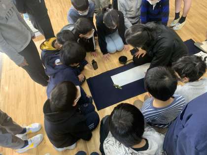 体育館で書き初め会を行いました。講師に書道家の齊藤燦月先生をお招きし、書き方のコツを一文字一文字丁寧に教えていただきました。2学期よりも上達した習字の作品を作りあげることができましたので、書き初め展でご覧ください。