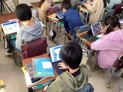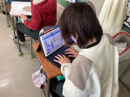 算数「多角形と円」の学習では、プログラミングを使って正多角形をかく学習を行いました。プログラミング言語やコードを覚えるのではなく、指定する数値を変えたり命令ブロックを組み替えたりすることを通して、論理的思考力を育むというねらいがあります。子どもたちは試行錯誤しながらいろいろな図形をかこうと取り組んでいました。