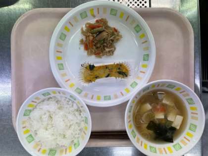 今日の給食は、ごはん、千草焼き、切干大根の煮つけ、みそ汁(豆腐)、牛乳です。