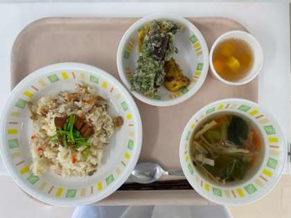 今日の給食は、ちらしずし、ちくわの二色揚げ、沢煮椀、ももゼリー、牛乳です。