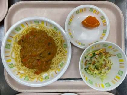 今日の給食は、スパゲッティトマトクリームソース、ぱりぱりサラダ、くだもの(せとか)、牛乳です。