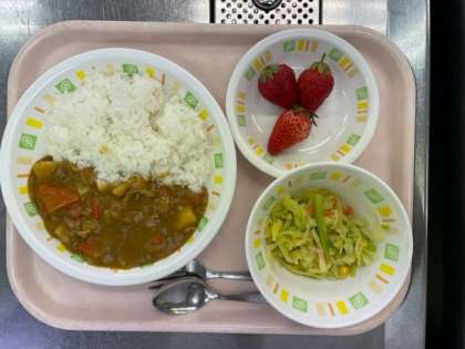 今日の給食は、カレーライス、コーンサラダ、くだもの(いちご)、牛乳です。