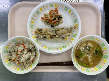 今日の給食は、五目ごはん、ししゃもの天ぷら、油揚げと野菜のおひたし、みそ汁(じゃがいも)、牛乳です。